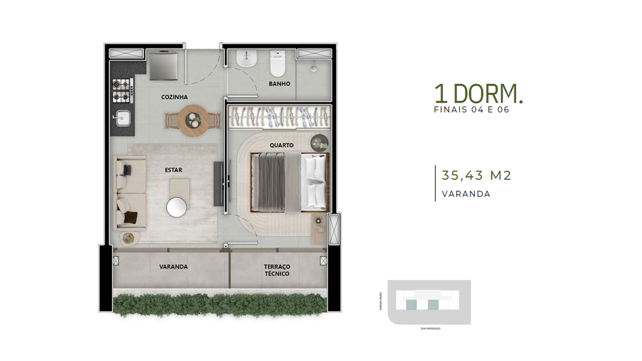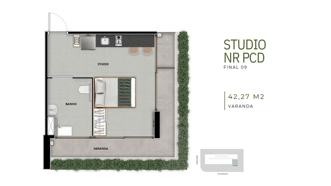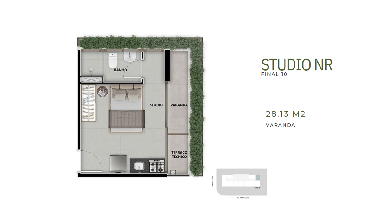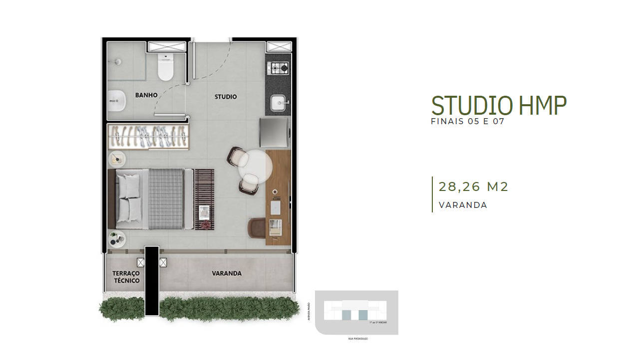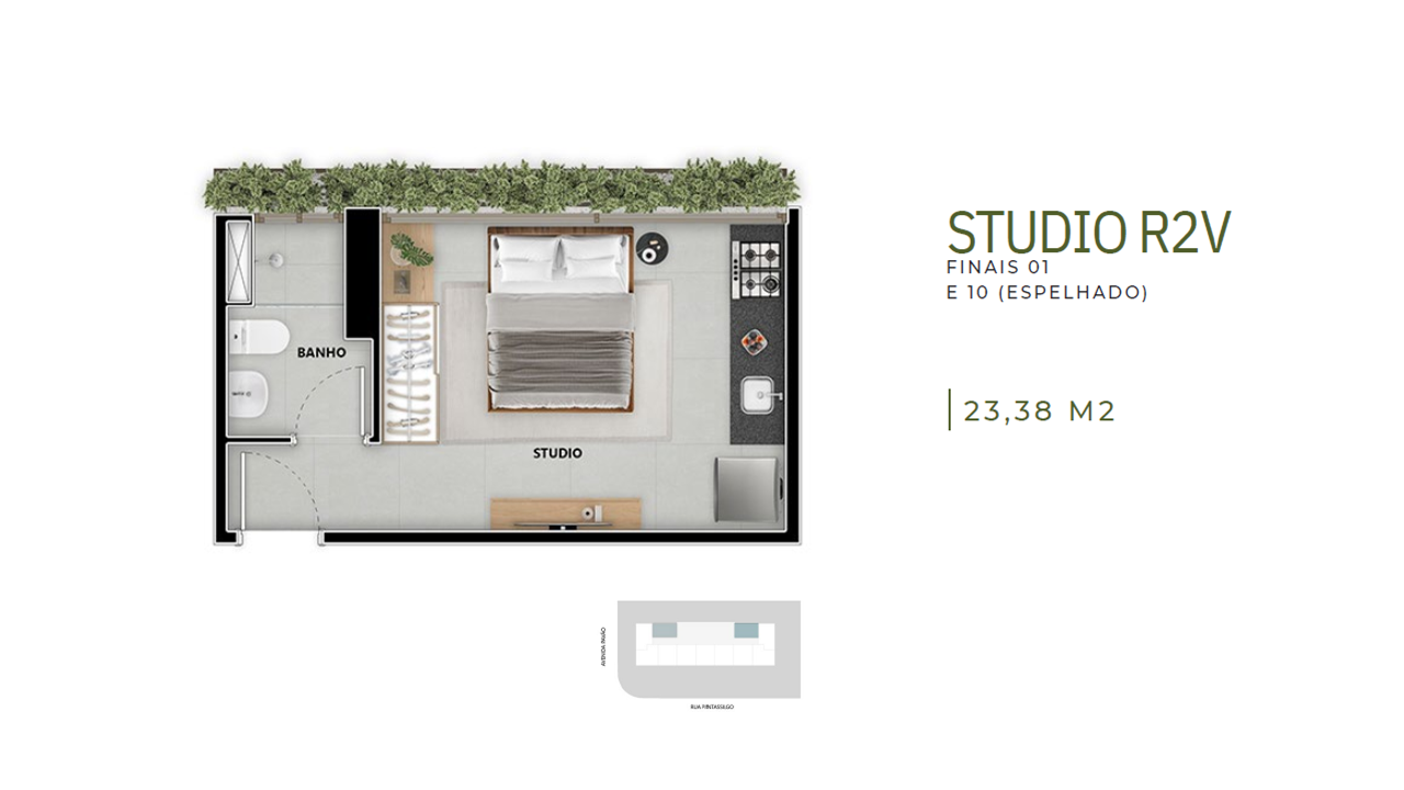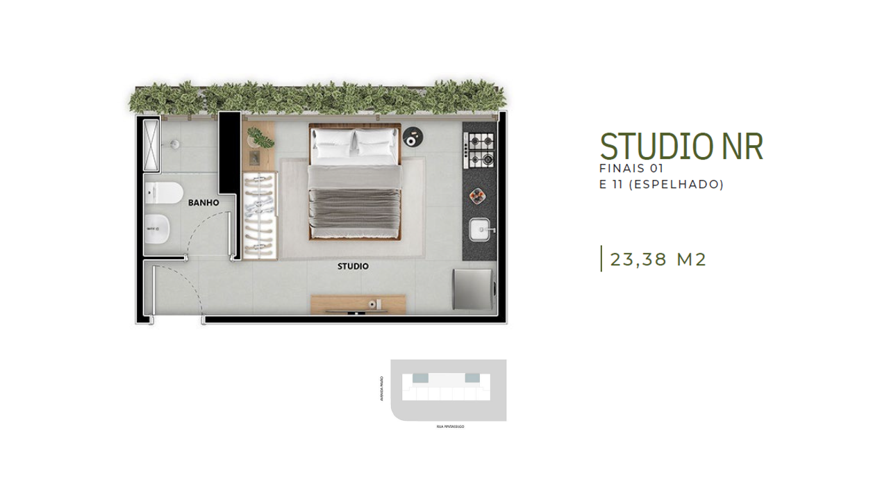 Studios e apartamentos de 1, 2 e 3 dormitórios, com uma infraestrutura completa de lazer, distribuídos em 4 pavimentos, sendo dois níveis de rooftop.