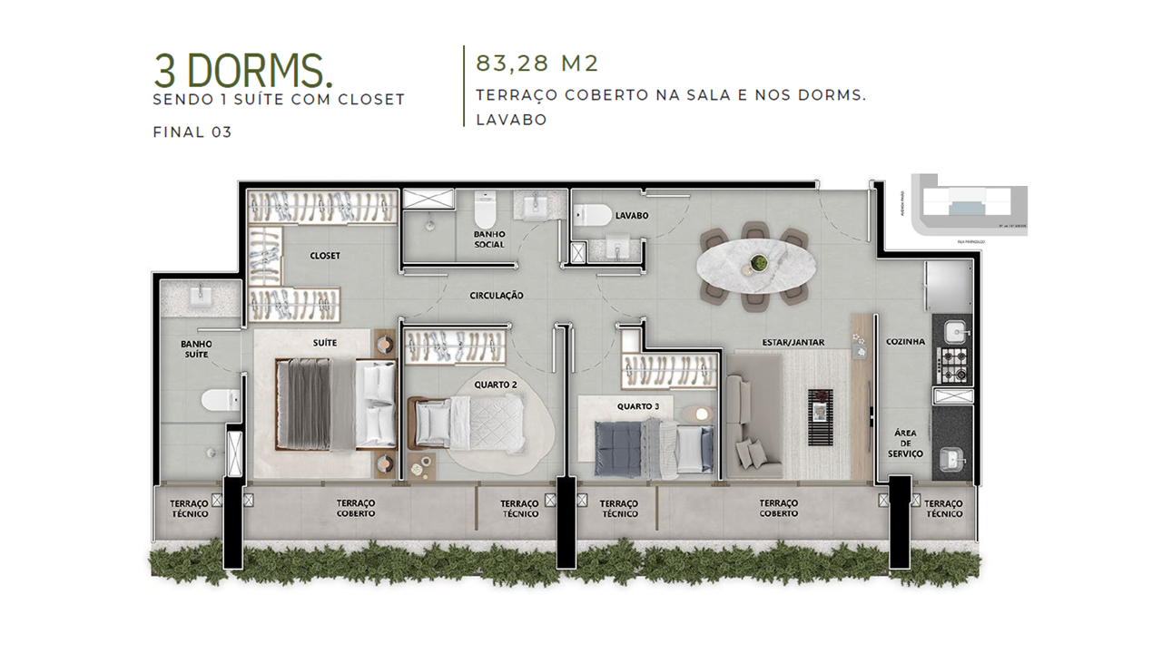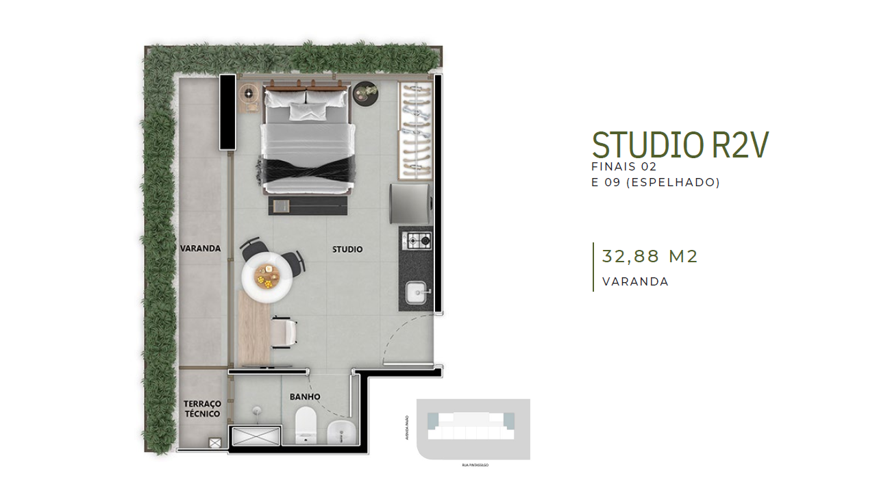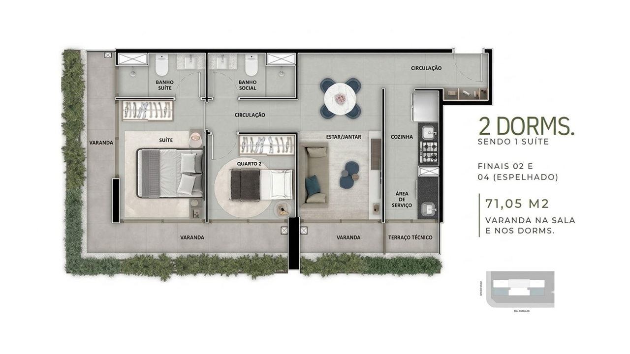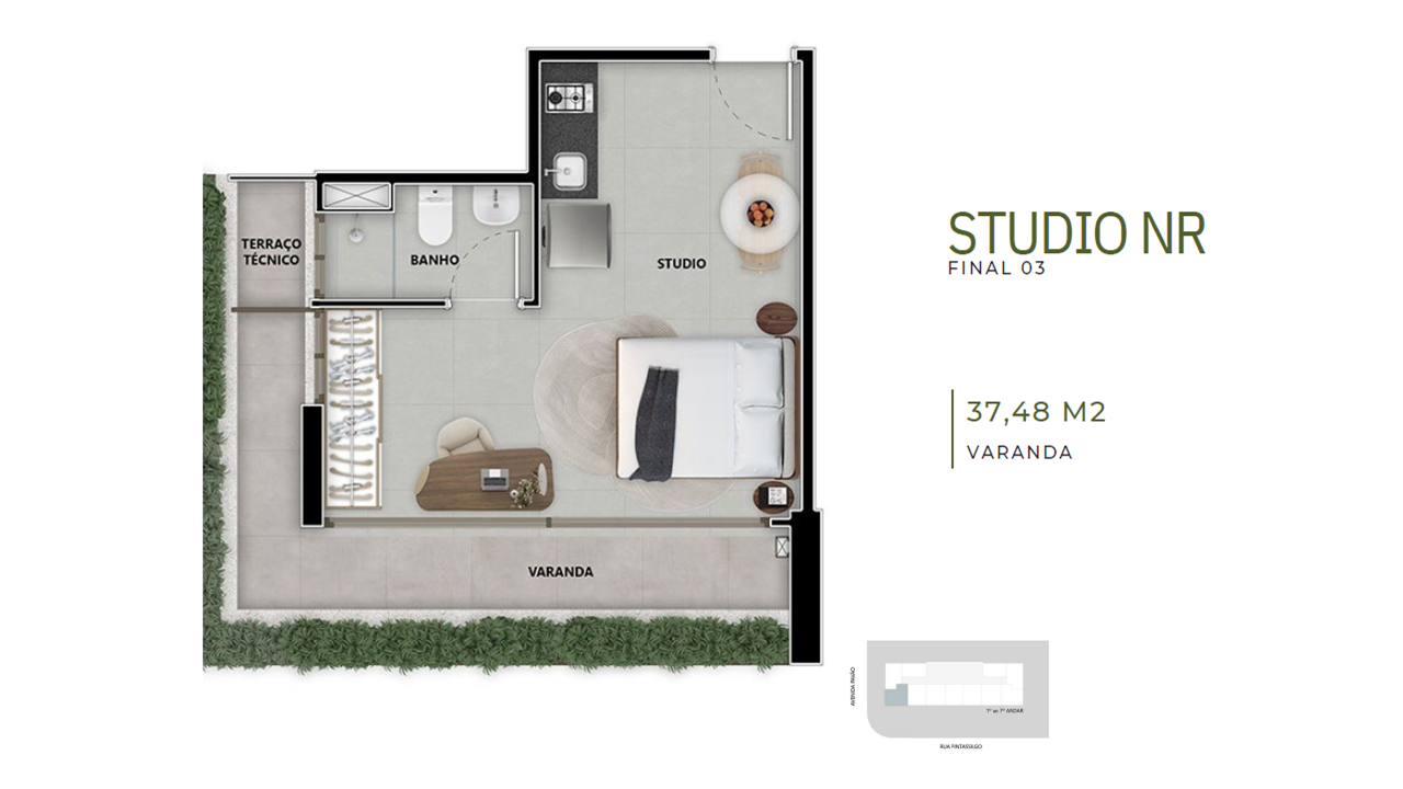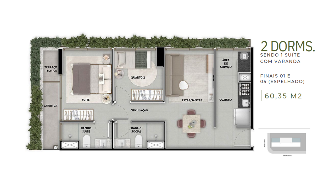Studios e apartamentos de 1, 2 e 3 dormitórios, com uma infraestrutura completa de lazer, distribuídos em 4 pavimentos, sendo dois níveis de rooftop.