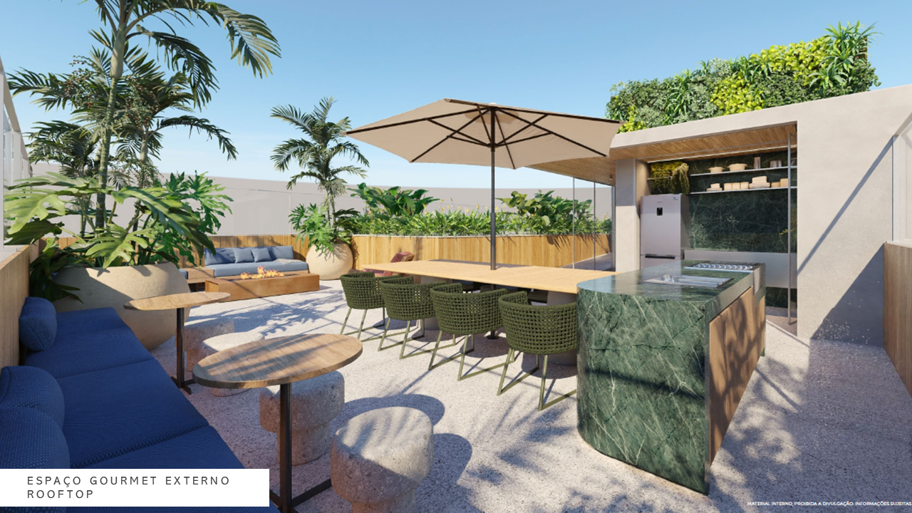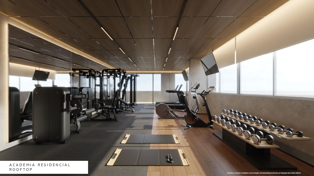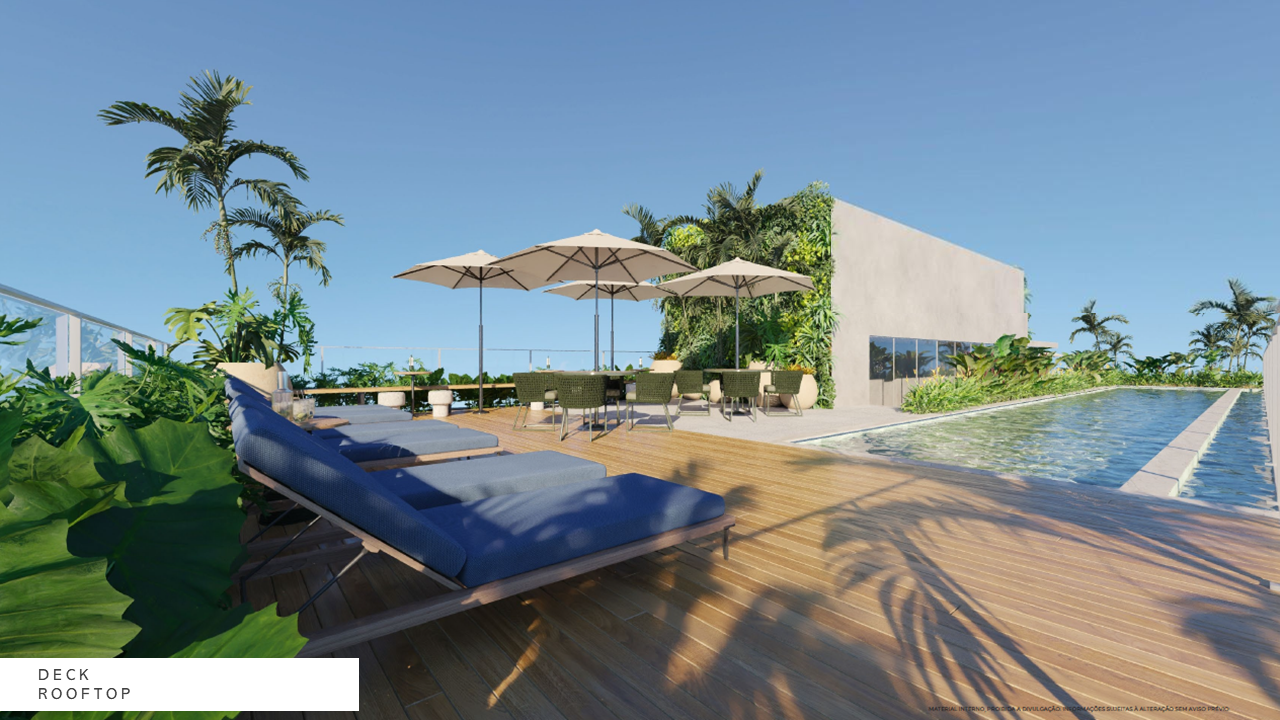 Studios e apartamentos de 1, 2 e 3 dormitórios, com uma infraestrutura completa de lazer, distribuídos em 4 pavimentos, sendo dois níveis de rooftop.