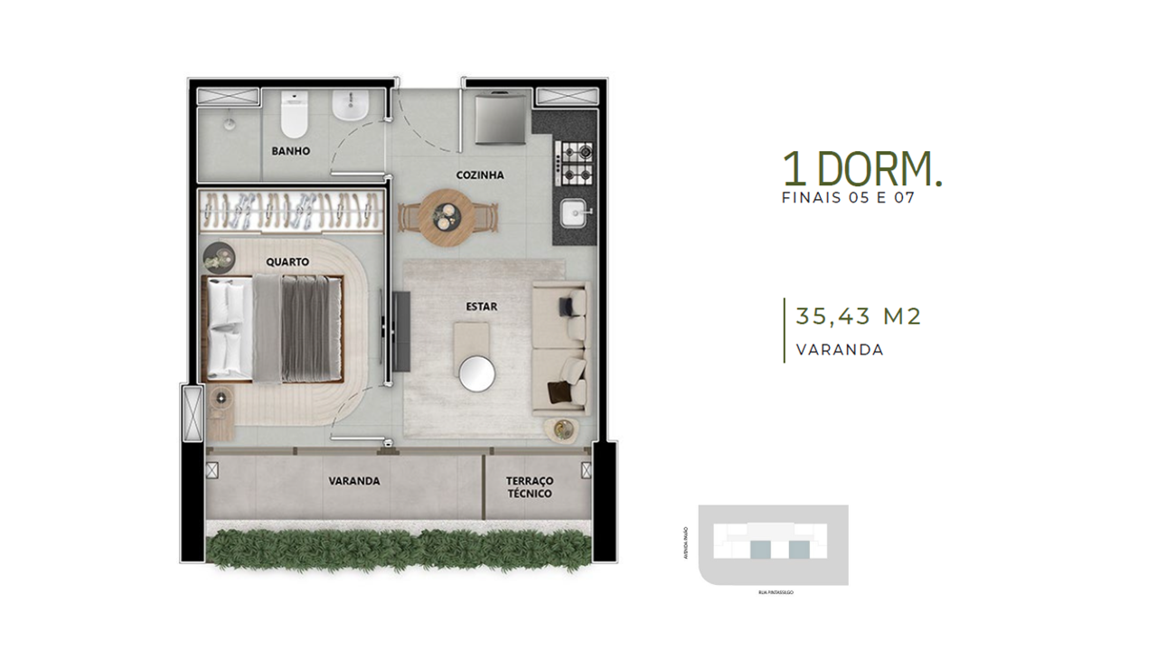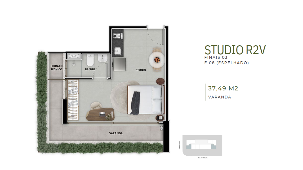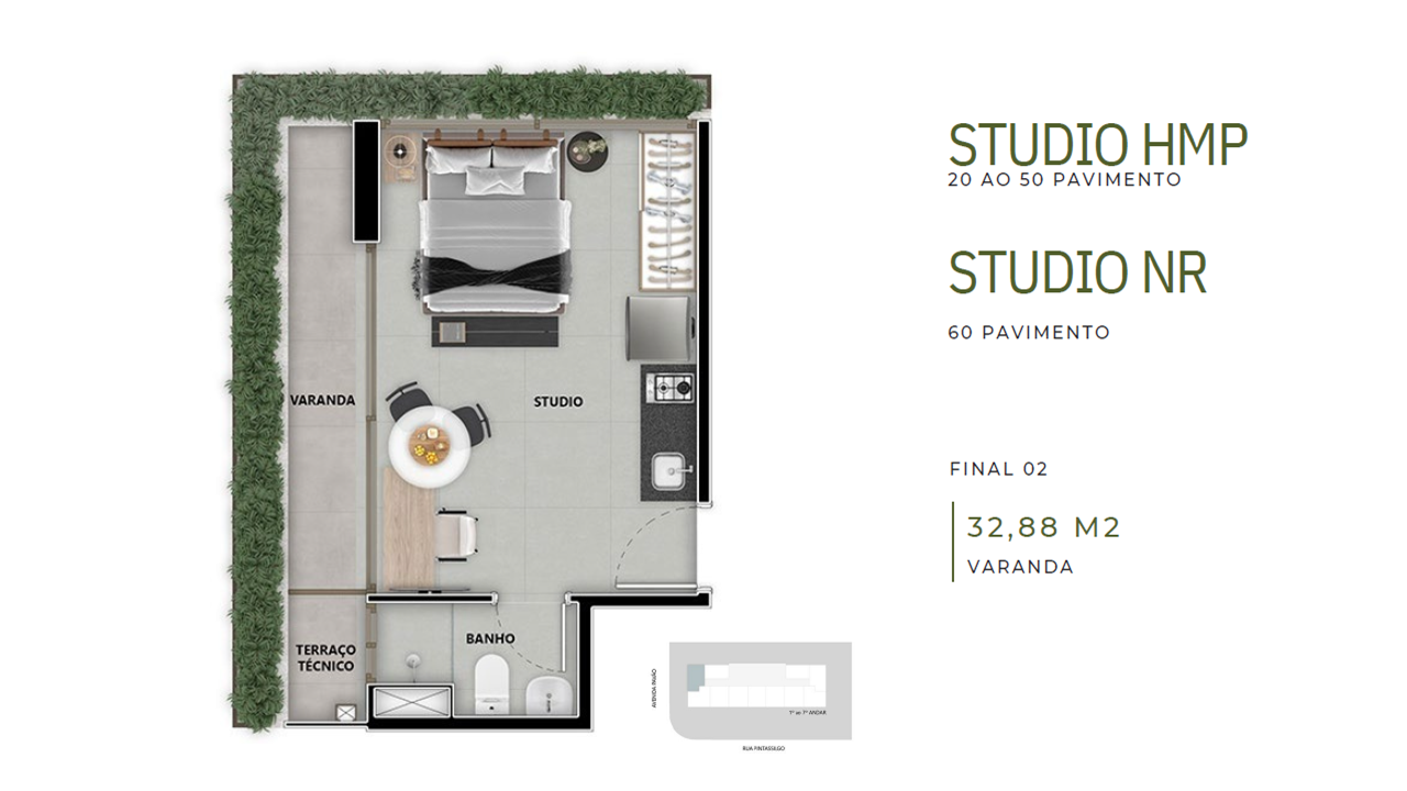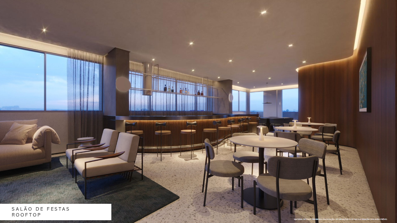 Studios e apartamentos de 1, 2 e 3 dormitórios, com uma infraestrutura completa de lazer, distribuídos em 4 pavimentos, sendo dois níveis de rooftop.